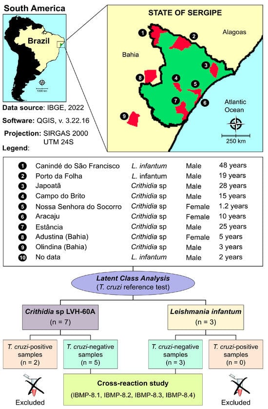 Among the ten serum samples, latent class analysis revealed that two Crithidia sp. LVH-60A-positive samples (28.6%) were potentially coinfected with T. cruzi. As a result, these two T. cruzi-positive samples were excluded from the study (Figure 2). According to the LCA classification, both samples were assigned as P5, indicating positivity for all four IBMP proteins with a posteriori probability of 100%. One sample belonged to a 25-year-old man residing in Estância-SE, while the other sample was obtained from a three-year-old boy living in Olindina-BA. Information regarding the likely routes of T. cruzi infection was not available. The remaining eight samples were classified as T. cruzi-negative, with seven samples classified as P1 (negative result for all four IBMP proteins) and one sample classified as P2 (negative result for three IBMP proteins). Notably, all L. infantum-positive samples tested negative for T. cruzi.