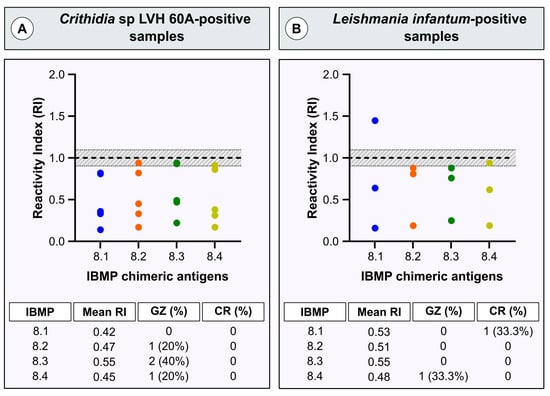 Following the serological definition of the samples as T. cruzi-positive or T. cruzi-negative using LCA, we investigated the potential antigenic cross-reactivity of four IBMP chimeric T. cruzi antigens with human leishmaniasis and Crithidia sp. LVH-60A antibodies (RI > 1.10) via ELISA. As illustrated in Figure 3, the chimeric antigens exhibited minimal cross-reactivity. Both Crithidia sp. LVH-60A (0.42–0.55)- and L. infantum-positive samples (0.48–0.55) exhibited low mean RI values across all four chimeric antigens. Notably, none of the analyzed antigens showed cross-reactions in the Crithidia sp. LVH-60A-positive samples. Similar results were noted for the L. infantum-positive samples, except for IBMP-8.1, which yielded a positive result in one sample (RI = 1.45). Undesirable results (gray zone) were observed in one sample when tested with IBMP-8.2 and IBMP-8.3, while two samples showed undesirable results with IBMP-8.4. All samples with these characteristics presented RIs ranging from 0.90 to 1.00. Regarding L. infantum, only one sample fell within the gray zone when tested with IBMP-8.4 (RI = 0.94).
