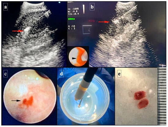 Images of the cryoprobe tip inside the lymph node (red arrows) in an endobronchial ultrasound-guided transbronchial mediastinal lymph node cryobiopsy procedure (EBUS-TBCNB). See the detail in the image of the circle of the cryoprobe entry through the preceding linear EBUS working channel (arrowhead) (a,b). The bleed point (black arrow) marks the puncture site of the linear EBUS and cryoprobe approach (c). Introduction of the cryoprobe with the sample attached to its tip into the buffer solution (d). Samples were collected using cryobiopsy (e).