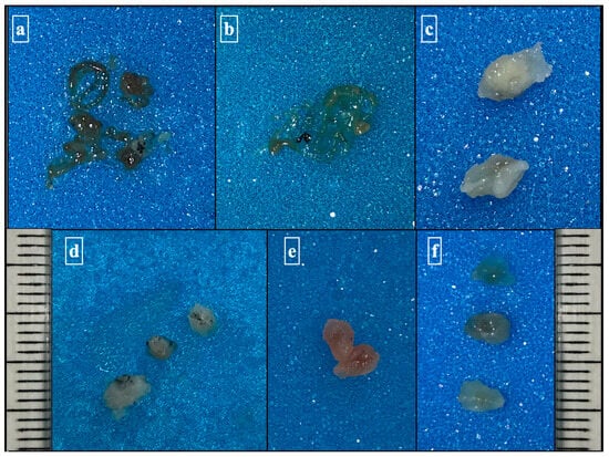 Chordonal material and small irregular fragments were obtained as cellblocks in linear EBUS (a,b). Macroscopic images of cryobiopsies composed of fragments ranging from 3 mm to 4 mm (c–f).