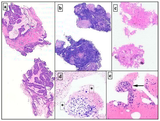 Slight magnification histological details of mediastinal lymph node cryobiopsy specimens almost entirely replaced by lung adenocarcinoma metastases (H&E ×2) (a). Representative lymph node fragments were obtained using cryobiopsy with the granulomatous histoarchitectural disorder (H&E ×2) (b). Microscopic view of lymph node cryobiopsies with tumor characteristics (H&E ×1) (c). Histology of linear EBUS cell blocks with neoplastic non-small cell lung carcinoma (NSCLC). Cells with no defined architectural pattern in a haematic background (asterisks and black arrow) (H&E ×5) (d,e). H&E: Hematoxylin–Eosin stain.