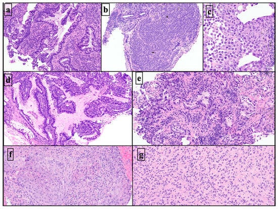 Histoarchitectural patterns in neoplastic cryobiopsy specimens. Acinar adenocarcinoma of the lung with well-defined glands replacing part of the lymphoid nodal tissue (H&E ×5) (a). Small cell lymphocytic lymphoma with diffuse pattern (H&E ×4) (b). Nodal metastasis from melanoma is composed of discohesive epithelioid cells with marked anaplasia and diffuse growth (H&E ×10) (c). Metastasis from adenocarcinoma of the lung with a papillary architectural pattern (H&E ×5) (d). Metastasis from acinar adenocarcinoma with irregular and fused glands with associated fibrodesmoplastic stroma (H&E ×7.5) (e). Pulmonary squamous cell carcinoma forms well-defined polygonal cell nests with dyskeratosis (H&E ×8) (f). Poorly differentiated sarcomatous neoplasm with diffuse pattern (H&E ×7.5) (g). H&E: Hematoxylin–Eosin stain.