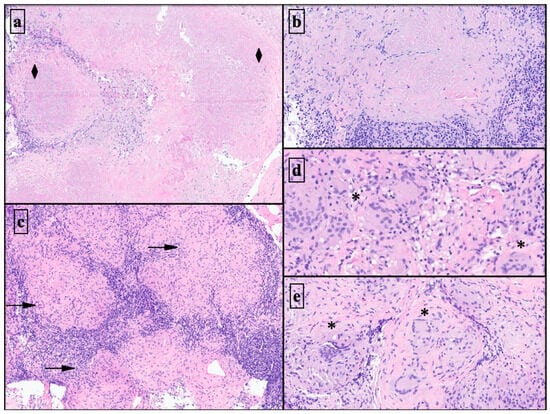 Histoarchitectural patterns in non-tumor cryobiopsy samples. Microscopic view of the nodular granulomatous lesion (black diamonds) in a patient with silicosis (H&E ×4) (a). Details of silicoid granulomatous nodule with lamellar fibrosis (H&E ×5) (b). The well-defined architecture of granulomatous sarcoid pattern in lymph node (black arrows) (H&E ×5) (c). Non-necrotizing granulomatous inflammation in pneumoconiosis with multinucleated giant cells (asterisks) is easily identified after cryobiopsy (H&E ×10) (d,e). H&E: Hematoxylin–Eosin stain.