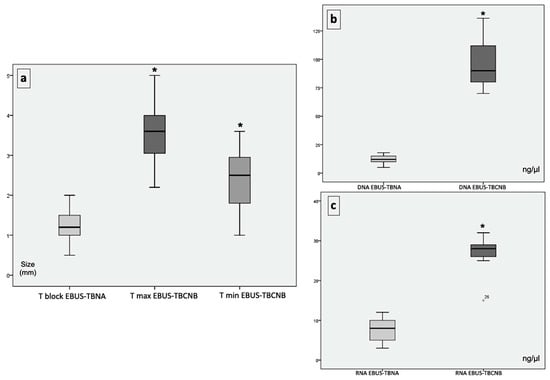 Graphical representation of sample size (mm). T block (cellblock size in EBUS-TBNA). T max (maximum cryobiopsy size). T min (minimum cryobiopsy size). Statistically significant differences (asterisks) versus cell block size in EBUS-TBNA (p < 0.05) (a). Graphical representation of the amount of DNA and RNA (ng/µL) extracted in EBUS-TBNA cellblocks and cryobiopsies. Statistically significant differences (asterisks) versus the amount of DNA/RNA in EBUS-TBNA cellblocks (p < 0.05) (b,c).