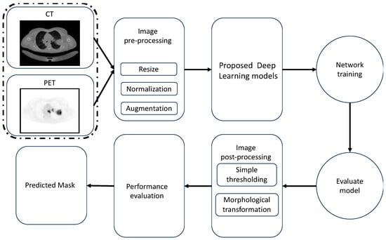 The proposed architecture for lung cancer segmentation is shown in Figure 1. Figure 1 depicts the three main stages of our framework: (1) image pre-processing, (2) multimodality U-Net segmentation, and (3) medical image post-processing. The pre-processing, augmentation, and post-processing methods are discussed in the following subsections.