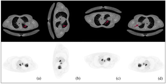 Some examples of the augmentation process of CT and PET images for STS: (a) the main CT-PET, (b) rotating the CT-PET by 90 degrees clockwise, (c) flipping the CT-PET upside down, and (d) left-mirroring the CT-PET. Red arrows indicate the tumour region.