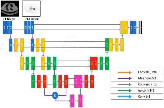 Figure 8 depicts the proposed hyper-dense VGG16 U-Net model, built upon the U-Net. Both CT and PET images can be fed into the model. The segmented image of lung cancer is the product of the model. In the suggested approach, input images for both CT and PET were 128 × 128. Each image input type has its dedicated input path, each with 16 CNNs (the number of CNNs in VGG16). Each dataset was processed through CNNs of varying sizes (64, 128, 256, and 512). Figure 6 shows that both input paths are incredibly well connected, and there are also many connections between the two. All convolutional neural networks used ReLU activation. The decoder’s structure comprises four groups of convolutional neural networks (CNNs) of varying sizes (1024, 512, 256, and 128).