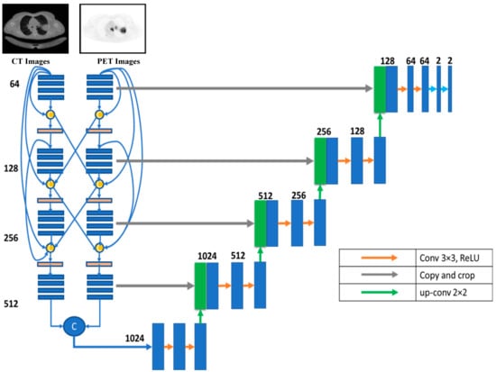 In various computer vision problems, shortcut connections between layers have become increasingly popular since the emergence of residual learning [26]. Unlike in conventional networks, these links back-propagate gradients immediately, which helps prevent gradient-vanishing issues and allows for more complex architectures. The idea of shortcut connections was expanded upon by DenseNet [27], which specified that each layer’s inputs should correspond to the outputs of all layers that came before them. Densely connected convolutional neural networks (CNNs) are built using the feed-forward principle, which entails adding direct connections from any layer to all succeeding layers. Deep networks are more accessible and more accurate to train because of this connectivity. This section proposes independently expanding U-Net to support DenseNet connections within the same multiple N streams of PET and CT modalities. Higher level layers of the proposed extension will also use the late fusion strategy.