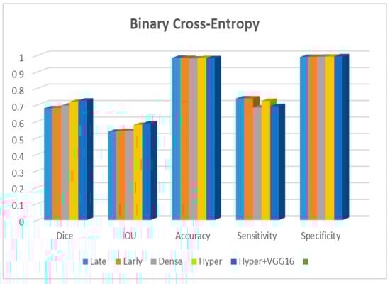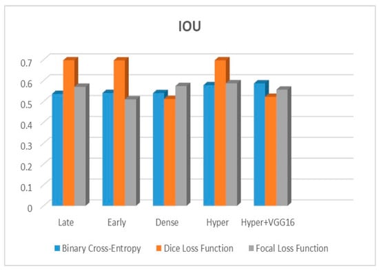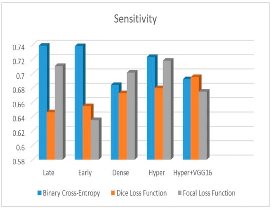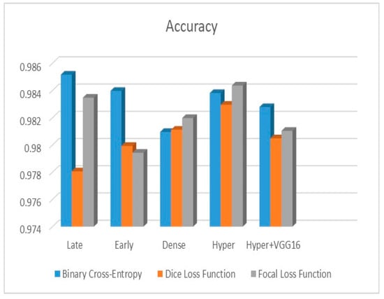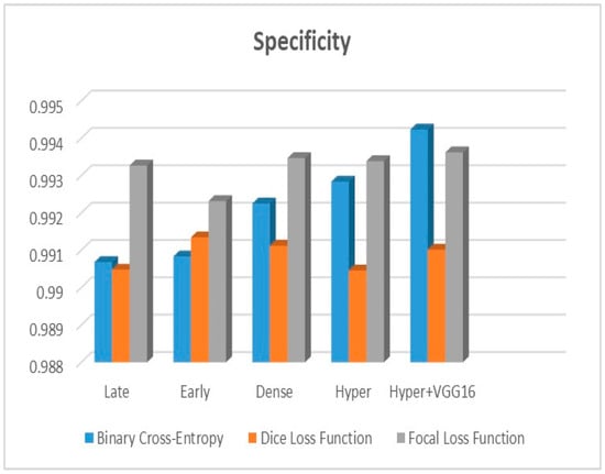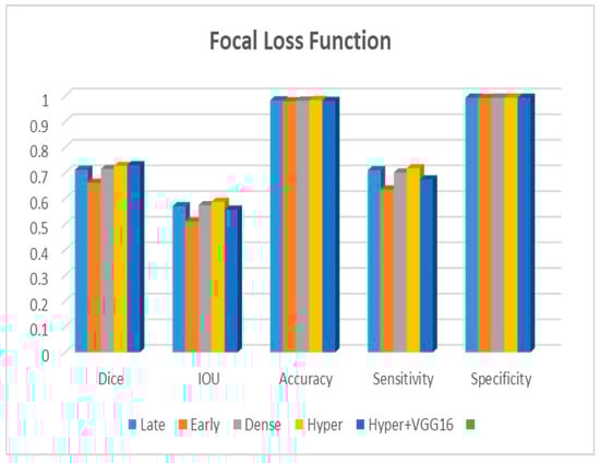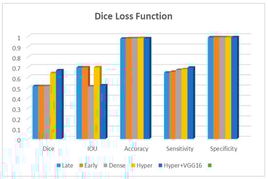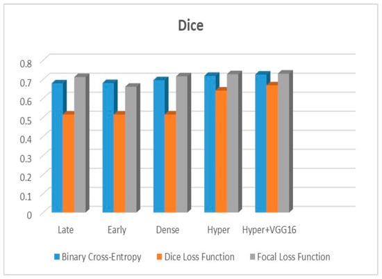 Figure 9, Figure 10 and Figure 11 depict the findings using various loss functions, like cross-entropy, focal loss, and Dice loss. In contrast, the performance measures for the proposed models using the metrics Dice, IoU, accuracy, sensitivity, and specificity are given in Figure 12, Figure 13, Figure 14, Figure 15 and Figure 16, respectively.