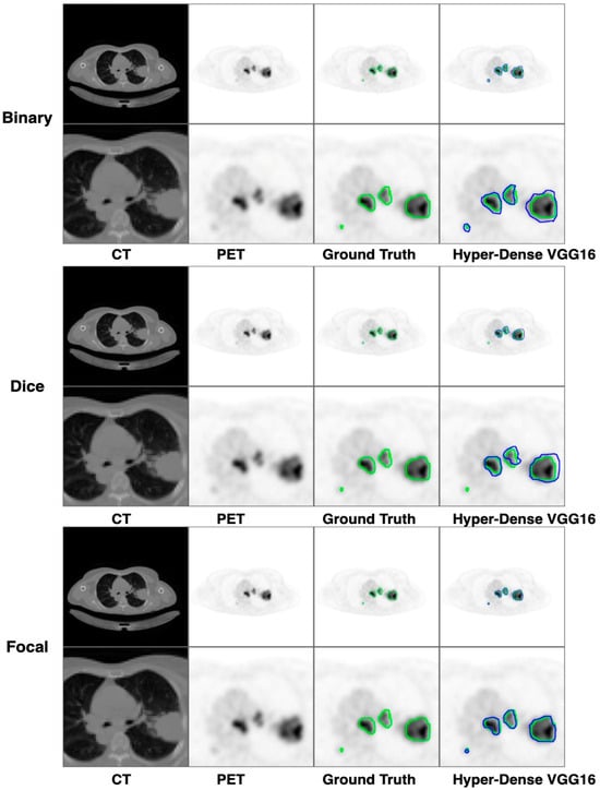 The comparison of lung tumour segmentation results, along with the segmentation outcomes for corresponding enlarged tumour regions, using our proposed hyper-dense VGG16 model with various loss functions (“Binary”, “Dice”, and “Focal”). The green contours outline the “Ground Truth” segmentation, and the blue contours outline results from the proposed model.