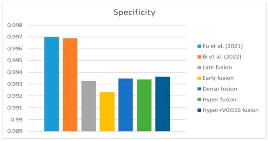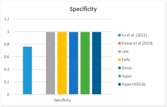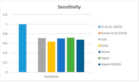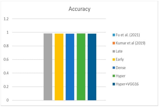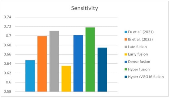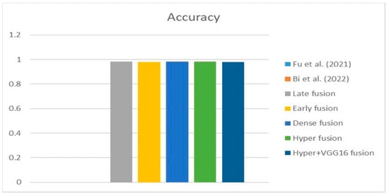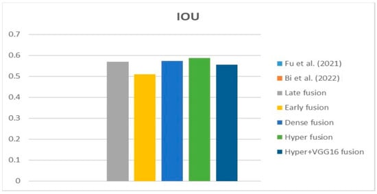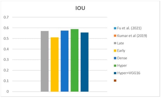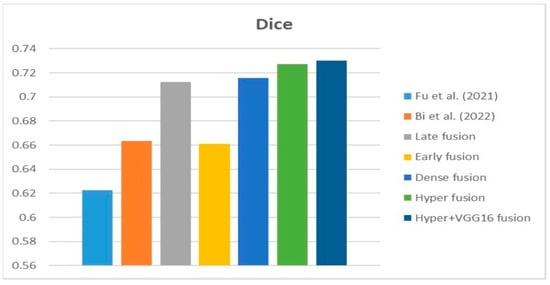 Table 6 compares the Dice, IOU, accuracy, specificity, and sensitivity metrics of the proposed model to those of benchmarked studies that employed different datasets, demonstrating the model’s superior performance. Table 6 show that the dense fusion model has a higher Dice value than the other models. Figure 23, Figure 24, Figure 25, Figure 26 and Figure 27 show visual representations of the performance metrics used in performance evaluation and the comparison of the proposed models.