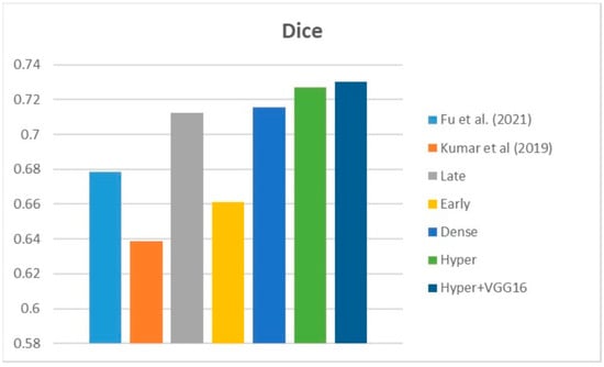 According to the data in the table and the graphs above, the suggested hyper-dense VGG16 model outperforms state-of-the-art models trained on the same dataset by a margin of Dice improvement equal to 17%. The proposed architecture for feature extraction between the two types of inputs and applying the VGG16 architecture of image feature extraction led to this enhancement.