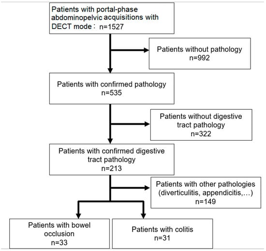 Over the study period, all patients with a digestive tract pathology were initially selected. Then, only patients with confirmed digestive pathology in the examination report were considered. Finally, among the confirmed digestive pathologies, only those for which we had at least 30 patients were included, in order to have a statistically significant sample for each pathology. Then, two pathologies were included in the study: intestinal obstruction and colitis. Figure 1 shows the flowchart for the selection of patients included. The final patient population was divided into two groups according to pathology: one for bowel obstruction and one for colitis.