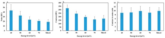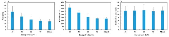 For patients with bowel obstruction, the noise decreased significantly according to the energy level from 40 to 60 keV by −47.2 ± 24.0% (range: −20.8 to −75.6), and was similar between 60 and 70 keV. The noise values were significantly higher for VMIs than for mixed images, except for 70 keV, 6.5 ± 6.1% (range: −16.7–8.3%). Similar results were observed for contrast values with a decrease between 40 and 70 keV of −56.3 ± 7.9% (range: −35.2 to −68.2), but all differences between image types were significant except between mixed images and VMIs at 70 keV with a difference of 0.9 ± 9.1% (range: −16.9 to −20.9). Similar outcomes were found for colitis, with a significant decrease in noise and contrast between 40 and 60 keV of −50.4 ± 18.2% (range: −4.8 to −76.3) and −56.2 ± 10.9% (range: −17.8 to −65.9), respectively.