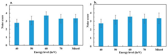 Results of mean noise scores assessed by two radiologists: (a) bowel obstruction group and (b) colitis group.