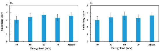 Figure 5 shows the image smoothing score for the two groups. For bowel obstruction, the maximum smoothing score was reported for VMIs at 60 keV. It increased significantly between 40 and 60 keV, and decreased significantly at 70 keV. The mixed image score was significantly higher than for images at 40, 50 and 70 keV, but not significant for 60 keV. For colitis, similar results were observed with the maximum score at 60 keV, and no significant difference between mixed images and the 60 keV score.