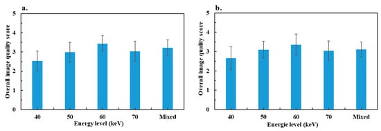 Results of the mean overall image quality score assessed by two radiologists: (a) bowel obstruction group and (b) colitis group.