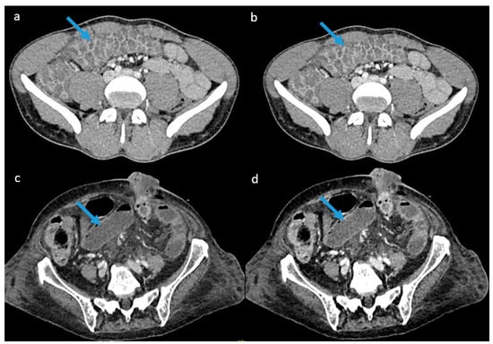 Example of images obtained for both pathologies: (a) mixed image generated for a 39-year-old male patient with colitis, (b) virtual monoenergetic image at 60 keV for the same patient. (c) mixed image generated for an 81-year-old female patient with bowel obstruction, and (d) virtual monoenergetic image at 60 keV for the same patient. Blue arrows indicate the pathological area.