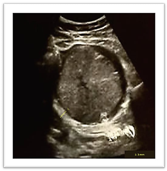 A vaginal delivery of a 2 kg male newborn occurred spontaneously after two days. The Apgar score at the 1st, 5th and 10th minute was, respectively, 10/10/10. Thirty minutes after delivery, despite active management of the third stage of labor, the placenta was still not delivered. An ultrasound evaluation showed the presence of an entangled placenta within the right uterine angle, and, according to Herman Ultrasound findings [12], the myometrium appeared thin at the placenta insertion but more than 2 mm (Figure 2), and there was no evidence of accreta spectrum.