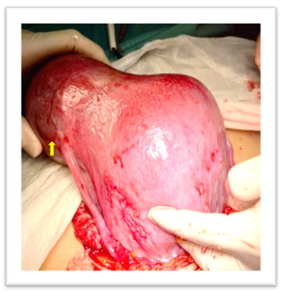 Two consecutive manual removals were attempted, without success. A third one by a senior operator was performed and failed due to a mechanical difficulty at placental extraction. Therefore, given the persistent uterine bleeding, around 600 mL, the administration of Oxytocin (20 IU, 500 mL normal saline, continuous infusion) and Tranexamic acid (1 g, 100 mg/mL) was started. The patient was informed about the need for a surgical treatment; therefore, she underwent a laparotomic exploration. The uterus appeared asymmetrically enlarged, with an irregular right cornual bulge, at the site of the trapped placenta (Figure 3).