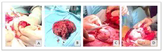 (A): uterine hysterotomy, (B): removed placenta, (C,D): uterine breach suture.