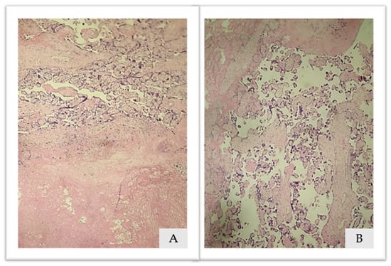 (A,B). Placental histopathological analysis: Hematoxylin and eosin 10×. (A): ischemic necrosis and (B): fibrinoid necrosis.