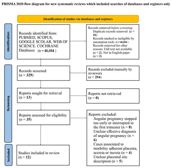 The PubMed, Scopus, Google Scholar and Web Of Science databases were searched electronically in February 2023, considering only papers from 1930 to the current year. Given the too heterogeneous definition of angular, interstitial and cornual pregnancies, it was decided to use the following three different search strings: “angular pregnancy AND retained placenta”, “cornual pregnancy AND retained placenta” and “Interstitial pregnancy AND retained placenta”. The reference lists of relevant articles and reviews were hand-searched for additional reports. The inclusion criteria were women diagnosed with an AP, that ended up with a live birth newborn, in which a retained placenta occurred. We excluded all the cases in which angular pregnancies ended too early, were terminated in the first trimester, cases of abnormally adherent placenta (placenta accreta) and cases finally diagnosed as interstitial or cornual pregnancies. The different AP therapeutic approaches were evaluated: surgical (demolitive and conservative) and/or conservative (pharmacological, manual removals and expectant management). For each kind of management, every complication was described. We decided to consider only full-text articles published in English. Two authors (G.B., P.Q.) independently searched and reviewed all papers and agreed about potential eligibility or paucity. Afterwards, they extracted the relevant data from each paper.