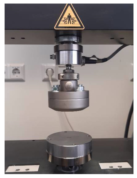 Experimental setup in the universal testing machine “ZWICK” (Retroline Z010 ZwickRoell, Ulm, Germany) for uniaxial compressive measurements.