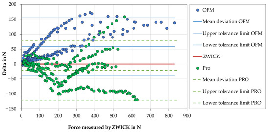 Graphical representation of the forces applied by the ZWICK testing machine (loading speed 0.3 mm/min) in Newtons (N) (set point) and the difference of the forces measured (theoretical occlusal forces) by the two occlusal force devices (OFM—occlusal force meter, PRO—prototype) in Newtons (N) compared to the ZWICK.