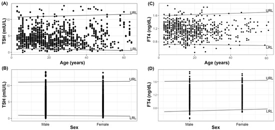 Trends of LRL and URL for TSH and FT4 according to age (A,C) and sex (B,D). Black dots represent the individual values of the hormones.