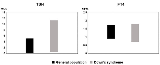 These values are determined as normal for the general population, but they cannot be applied to individuals with Down syndrome since there is evidence that TSH is usually elevated, but without specific limits, which may encourage overdiagnosis of subclinical hypothyroidism in these patients [1]. We can observe this in studies such as that by Cebeci et al. [10], where the median TSH at the first visit is 10.40 (19.4) mIU/L and FT4 is 1.18 (0.43) ng/dL. On the other hand, Amr [1] noted that several studies showed TSH > 10 mIU/L, with an average TSH level of 16.2 mIU/L. Also, antibodies against thyroid peroxidase (TPO) are found in up to 31% of patients with Down syndrome [1,8].