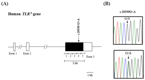 Identification of genetic polymorphisms of the human TLR7 gene in healthy and COVID-19 patients. (A) Simplified the sequenced region map of the human TLR7 gene. The edged horizontal bar indicates the regions sequenced (3387 bp). Vertical lines indicate the genetic polymorphism identified in this study. (B) Electropherograms of a rare single nucleotide polymorphism (SNP) of the TLR7 gene found in the current study. The colors of the peaks indicate each base of nucleotides (green: adenine; red: thymine; blue: cytosine; and black: guanine).