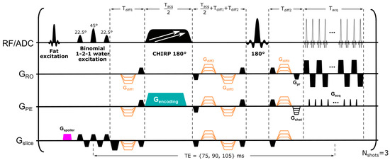 SPEN sequence used in this study, employing dual frequency swept chirp pulses for simultaneous spatial encoding of two frequency ranges along the PE direction. The sequence incorporates diffusion-sensitizing gradients (in orange). To minimize intensity of residual fat signal, a fat-excitation/spoiler unit, followed by a slice-selective binomial 1-2-1 water excitation pulse, was used. Diffusion gradient timings were calculated as described by Reese et al. [42]. Abbreviations: Gspoiler, spoiler gradient; Gencoding, encoding gradient; Gslice, slice-selective direction; GPE, phase-encoding direction, corresponding to direction of SPEN encoding; GRO, readout direction; Gpr, readout prephase gradient; Gshot, phase-encoding prephase gradient; Gacq, blipped acquisition gradients; Tdiff_1 and Tdiff_2, duration of first and last diffusion-encoding gradients; Tacq, acquisition time; Nshots, number of interleaved shots (segments). For acquiring the coil sensitivity maps, the dual frequency swept chirps were replaced with a single chirp sweeping a single-breast frequency range, while the rest of the parameters remained unchanged.