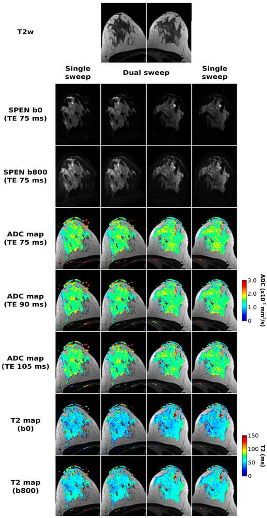 Diffusion-weighted imaging (DWI) can increase the diagnostic value provided by dynamic contrast-enhanced (DCE) MRI for breast cancer characterizations [1] and, as such, it is rapidly becoming an integral part of the multiparametric breast cancer MRI protocol [2]. DWI relies on the intrinsic contrast provided by breast tumor masses on the apparent diffusion coefficient (ADC [3,4]) of water molecules in breast cancer, which experiences a significant reduction vs. its value in healthy fibroglandular tissue. This is assumed to reflect an increased local cellularity of the tumoral masses [5,6], which, by either increasing the macromolecular protein/membranous content and/or by reducing the available extracellular space, reflects a restricted water diffusivity. An increase in macromolecular density should also affect the transverse relaxation time, T2, of the water [7]. T2-weighted images do indeed play a role in the breast cancer MRI analysis, by providing an anatomical reference [8], improving the delineation of non-mass ductal carcinoma in situ (DCIS) lesions [9], and omitting unnecessary biopsies when identifying benign, bright lesions in T2-weighted scans [10,11,12]. However, beyond serving as an adjunct tool to better characterize the breast anatomy, the use of quantitative T2 values is uncommon in the clinical settings—even if its potential benefits for breast imaging have often been discussed [13,14,15]. This stems from various reasons, including long scan times associated with the acquisition of quantitative T2 information, as well as relatively low levels of separation between benign and malignant tissues when using solely T2 [16].
