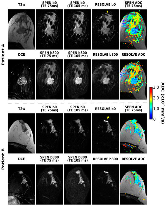 SPEN and RESOLVE acquisitions arising from b = 0 and 800 s/mm2 diffusion weightings, along with the resulting ADC maps, for two of the patients enrolled in the study. Also shown for completion are two DW SPEN image sets acquired with TEs of 75 and 105 ms, as well the T2w and subtracted DCE images. The TE for the RESOLVE experiments was 67 ms. Some of the distortions observed in the RESOLVE images are highlighted with yellow arrows. For Patient A (corresponding to patient 1 in Table 1), lesion borders coincide with the mass enhancement in DCE image, while for Patient B (corresponding to patient 5 in Table 1), essentially all the non-fatty tissue present in T2 image was judged to be cancerous.