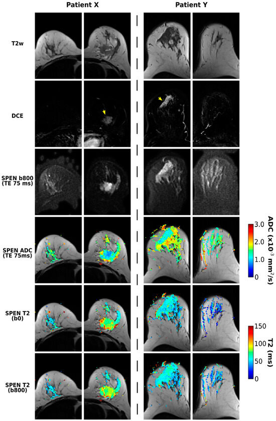 SPEN acquisitions for two patients (X and Y, corresponding to patients 12 and 7 in Table 1, respectively) diagnosed with breast carcinomas. Presented on the top rows are T2w, DCE, and DW images collected for TE = 75 ms, with the lesions labeled with yellow arrows. Shown on the lower rows are ADC maps derived from images acquired using TE = 75 ms, as well as T2 maps derived from b0 and b800 DWI data.