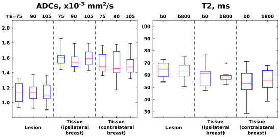 With these tools at hand, Figure 5 presents boxplots of the ADC and T2 values resulting from patient-oriented measurements at various TE and b-weightings, respectively. Here, each of the patients contributes a single data point per boxplot as an averaged value over the whole relevant region-of-interest (ROI); i.e., after delineating ROIs corresponding to cancerous and healthy tissues for each of the patients, mean T2 and ADC values over all of the voxels corresponding to these ROIs were calculated. Averaged ADC and T2 values over all voxels arising from slices located in the same axial plane, but in the contralateral (non-diseased) breast, are presented in these box plots as well. Contralateral breasts did not contain cancerous tissue in any of the patients, as was confirmed by examination of the DCE images. For one of the subjects, it was not possible to perform T2 mapping due to motion between the DW acquisitions using different TEs; hence the respective boxplots summarize ADC values for 12 patients and T2 values for 11 patients. It follows from these results that ADC values provide a clear diagnostic separation between healthy and cancerous tissue for every TE value. Average T2s are clearly inferior to ADCs as indicators of cancer regardless of b-weightings—even if there seems to be, on average, slightly longer T2s for the ROIs with lesions. The ADC values derived at longer TEs, as well as T2 values derived using b-weighting, provide larger scatterings vis-à-vis values derived at the shortest TE and no b-weighting, respectively. This is arguably a consequence of sensitivity penalties arising at these larger b- and TE values.