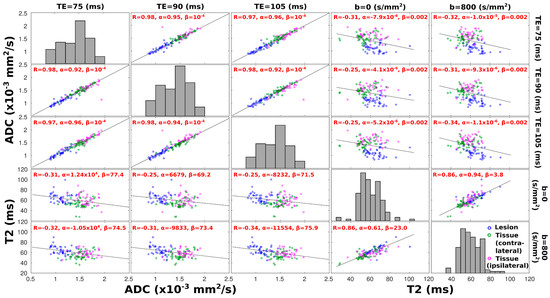 Scatter plots of mean ADC and T2 values calculated over regions corresponding to cancerous (blue dots) tissue, to healthy tissue arising from the contralateral breast (green dots), and to the ipsilateral, lesion-containing breast (pink dots). Each data point corresponds to the average value over the respective area from one slice; only data from slices containing lesions and corresponding contralateral slices are included in this analysis. For the first three columns (rows), x-axes (y-axes) describe ADC values, while for the fourth and fifth columns (rows), x-axes (y-axes) describe T2 values. Respective TE/b-values at which ADC–T2 values were derived are given on the top and right side of the plots. Diagonal subplots display a histogram of distribution of the ADC or T2 values derived at a given TE or b-value, respectively. For each off-diagonal plot at the top left corner, a correlation coefficient R is provided, along with linear regression coefficients α and β, corresponding to slope and intercept, respectively; a least-squares reference line with slope equal to the Pearson’s correlation coefficient is also drawn. All correlation coefficients display correlations that are significantly different from zero (p-values < 0.05).