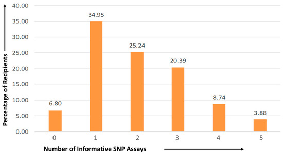 Upon employing the selected SNP assays based on Indian MAF, it was observed that among the 103 recipients, 7 (6.80%) individuals did not have any informative assays, yielding an efficiency rate of 93.2% for the selected SNPs in detecting donor-derived cell-free DNA in our study. Among the recipients, the majority, 36 (34.95%) exhibited a single informative SNP assay, followed by 26 (25.24%) recipients with two informative assays. Additionally, 21 (20.39%) recipients showcased three informative assays, while 9 (8.74%) and 4 (3.88%) recipients demonstrated four and five informative assays, respectively, as represented in Figure 3.