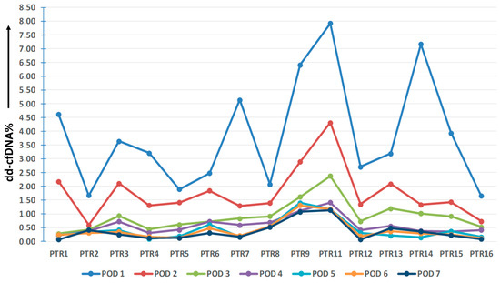 The PTR group consisted of 16 patients. Blood samples were collected daily for 7 days from these patients for 7 days post-transplantation. This will help in the analysis of the concentration pattern and daily fluctuations in dd-cfDNA levels in the first week of transplant. Among the 16 patients, one was excluded from the analysis due to the absence of informative SNPs among the selected assays. As a result, a total of 90 samples from 15 patients within the PTR group were subjected to analysis. The dd-cfDNA% values for each patient over the course of seven days are presented in Figure 4.