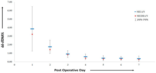 Time-course in dd-cfDNA% during the first week after kidney transplant recipients.