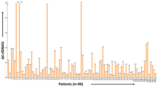 A comprehensive analysis encompassed a total of 87 patients within the RR group. Six patients were excluded from further analysis due to the absence of informative SNP assays. Notably, the RR group also incorporated 15 patients from the PTR group, wherein the dd-cfDNA value on the 7th day post transplantation was considered for analysis. Thus, a cumulative total of 96 patients, along with their corresponding samples, were subject to thorough examination. The distribution of dd-cfDNA% among these 96 patients is visually depicted in Figure 6.