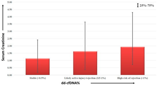 Within the RR group, patients were classified into three distinct categories, based on the percentage of dd-cfDNA present in the recipients’ plasma. These categories comprised: stable (<0.5%), likely indicating active injury and/or rejection (0.5–1.0%), and posing a high risk of rejection (>1%). The median (with interquartile range) serum creatinine levels for each category were calculated and graphically depicted, as illustrated in Figure 7. The stable group exhibited a median serum creatinine level of 1.21 (0.95–1.28) mg/dL, the category at likely risk of active injury had an average serum creatinine level of 1.63 (1.27–2.01) mg/dL, and finally, the high risk of rejection group displayed an average serum creatinine level of 1.93 (1.22–2.36) mg/dL.