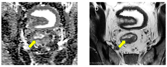 Typical MR imaging appearance of KARAS + or − tumor (yellow arrow) on (a) ADC and (b) T2-weighted images.