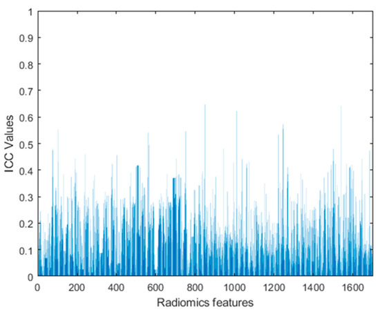 The radiomics workflow is composed of various steps that are summarized in Figure 2. The ICC values between two platforms demonstrated low-level (>0.7) feature stability between them and for all the features due to different MRI parameters between the platforms (see Figure 3).