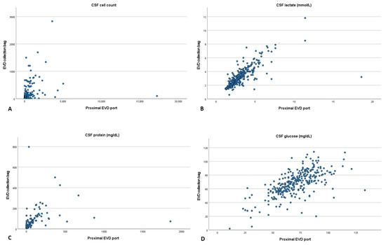 Scatter plot comparing cerebrospinal fluid parameters acquired from the proximal port and collection bag of an external ventricular drain. (A) Cell count, (B) lactate, (C) protein and (D) glucose. CSF: cerebrospinal fluid; EVD: external ventricular drain.