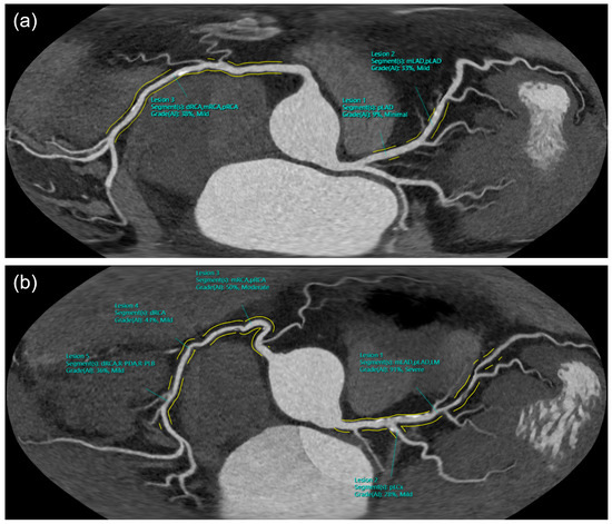 Examples of the unfolded view. (a) patient with mild CAD (CAD-RADS 2) and (b) patient with severe CAD (CAD-RADS 4A).