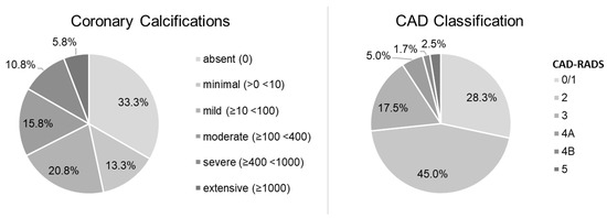 The study population consisted of 120 patients (79 men, 41 women) with a median age of 62.4 (55.0–72.7) years. Men were significantly younger than women (61.4 (54.5–69.4) years vs. 66.9 (55.5–75.7) years; p < 0.05). The median body mass index (BMI) was 26.7 (24.9–30.3) kg/m2 and the median heart rate during the coronary CTA was 61.5 (57.5–65.5)/min. The median Agatston score was 20.1 (0.0–174.6) and coronary calcifications were absent in 40 patients (33.3%), minimal in 16 patients (13.3%), mild in 25 patients (20.8%), moderate in 19 patients (15.8%), severe in 13 patients (10.8%), and extensive in 7 patients (5.8%). The CAD severity classified by CAD-RADS was as follows: CAD-RADS 0/1 in 34 patients (28.3%), CAD-RADS 2 in 54 patients (45.0%), CAD-RADS 3 in 21 patients (17.5%), CAD-RADS 4A in 6 patients (5.0%), CAD-RADS 4B in 2 patients (1.7%), and CAD-RADS 5 in 3 patients (2.5%). The distribution of coronary calcifications and CAD severity is displayed in Figure 3.