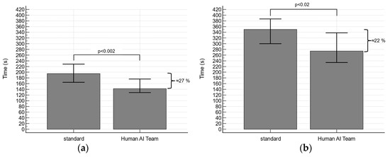 The time for the coronary CTA assessment was significantly reduced in the human AI group compared to the standard group by approximately 27% (142.5 (106.5–215.0) s vs. 195.0 (146.0–265.5) s; p < 0.002; Figure 4a). Accordingly, the total reporting time was significantly lower in the human AI group (274.0 (208.0–377.0) s vs. 350.0 (264.0–445.5) s; p < 0.02; Figure 4b), which corresponds to approximately 22%.