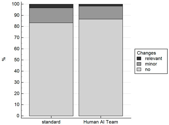 The number of cases with no changes, with minor changes, or with changes relevant to CAD-RADS did not differ significantly between the standard group and the human AI group.